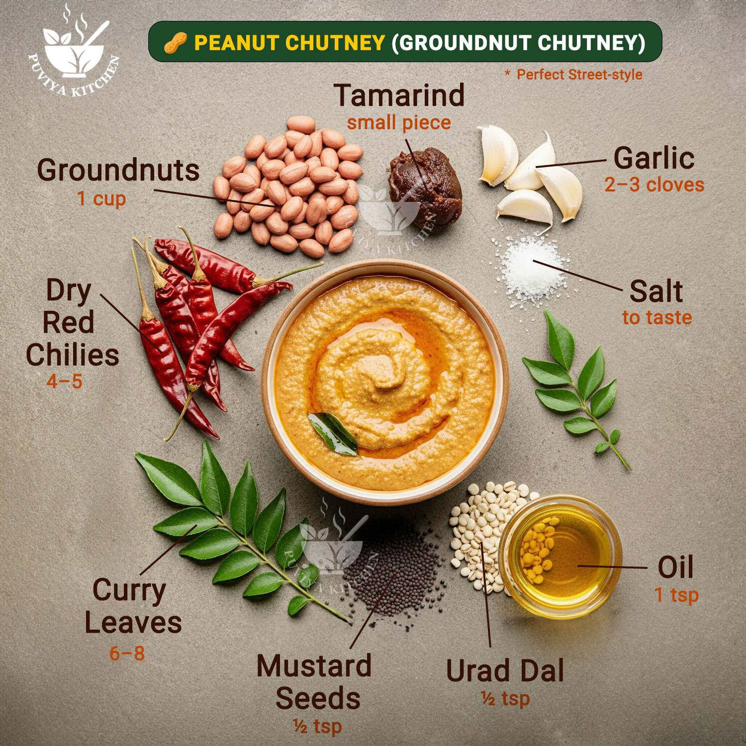 Make Andhra-style peanut chutney at home! This flavorful chutney combines roasted peanuts, garlic, red chilies, and tamarind for a rich, nutty taste. Perfect as a side with idli, dosa, upma, pongal, vada, or hot rice. Quick, easy, and authentically South Indian.