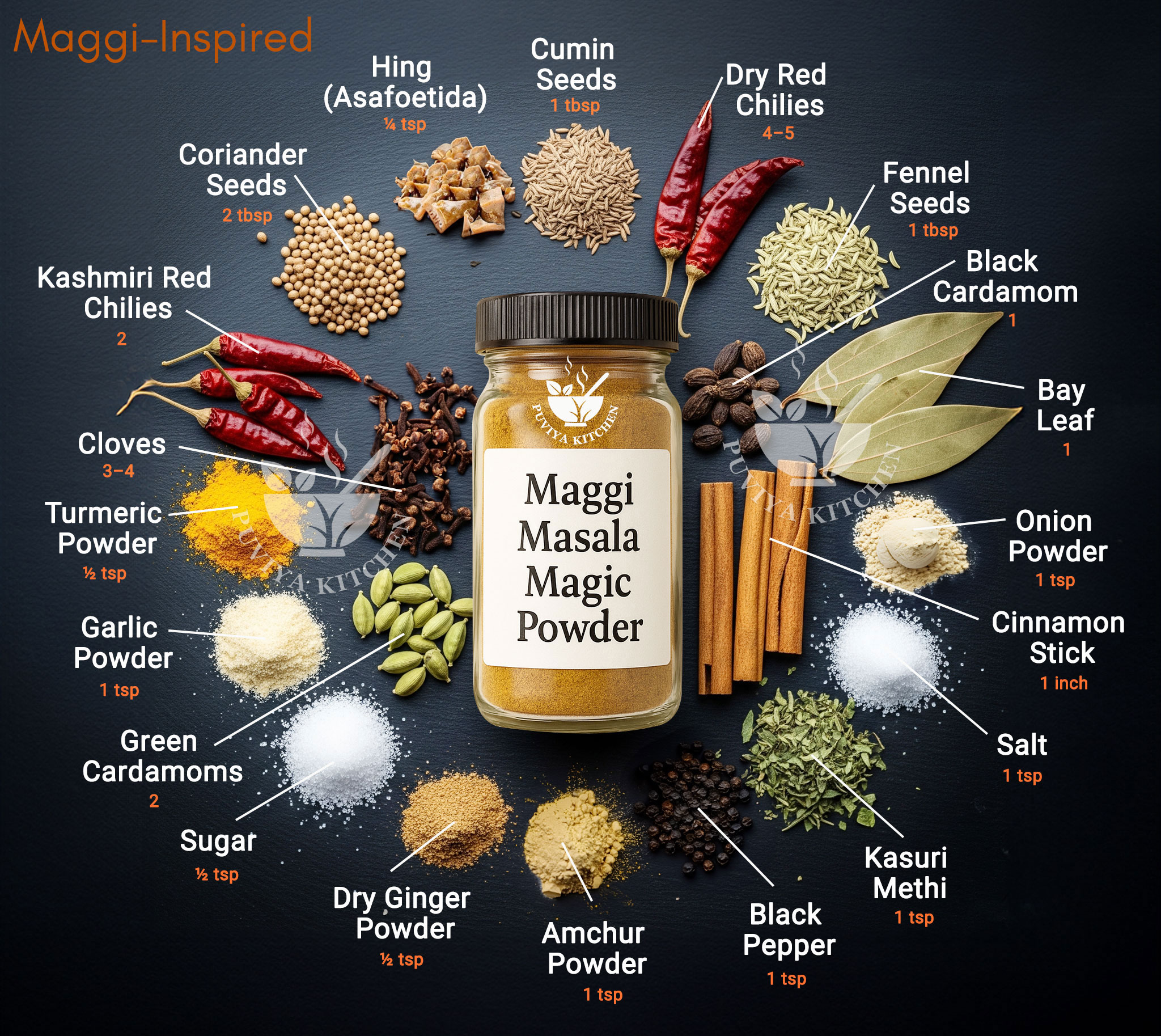 Bring home the nostalgic taste of Maggi Masala Magic with this simple homemade spice blend. Packed with aromatic spices and natural flavors, this DIY masala powder is perfect not only for noodles but also for curries, fried rice, pakoras, and Indian snacks.